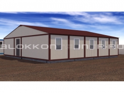 ГлавнаяПроектыМодульные здания → Модульное одноэтажное общежитие из 10 шт 5м блок-контейнеров, с коридором 1м